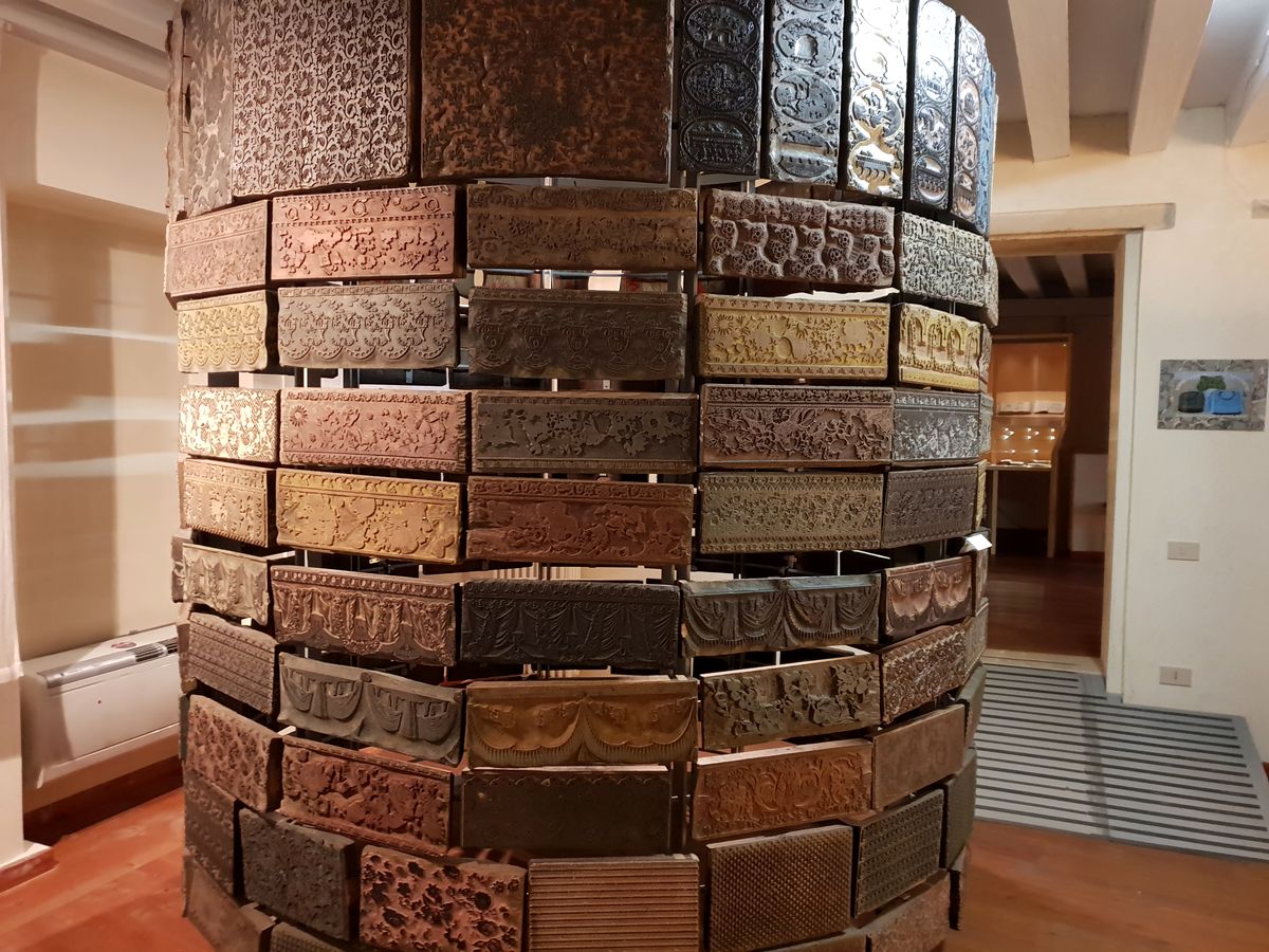 Une Tour formée par des plaques en bois sculptés servant à imprimer au musée de l’Impression de Bassano del Grappa.