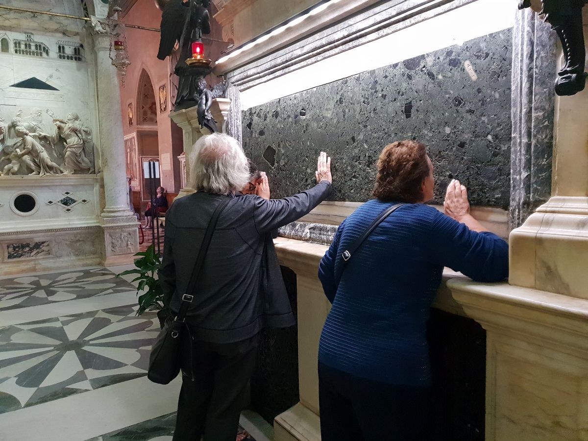 Fidèles se recueillant devant le tombeau de Saint-Antoine de Padoue.
