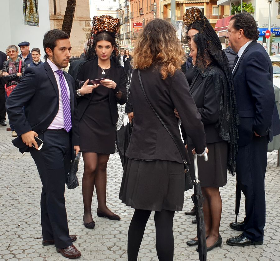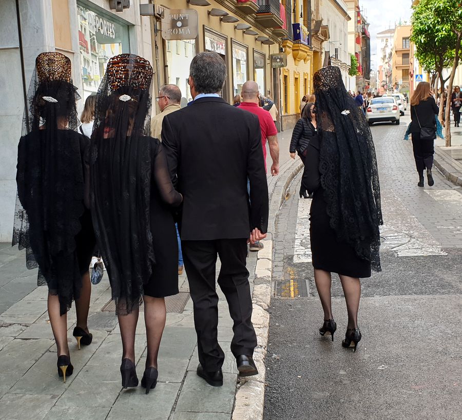 Et il ya a aussi les élégantes vêtues de robes noires moulantes, perchées sur de hauts talons, coiffés d’un peigne haut à partir duquel cascade une longue mantille en dentelle noire. Je ne les ai vues qu’avant la Madrugada.