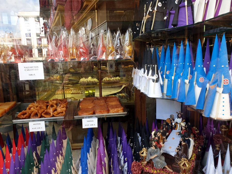 Vitrine de la Campana. La célèbre pâtisserie reproduit les confréries les plus célèbres pour en faire des bonbonnières.