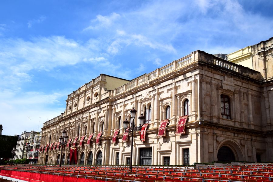 La mairie de Séville avec les gradins qui longent la Carrera Oficial.