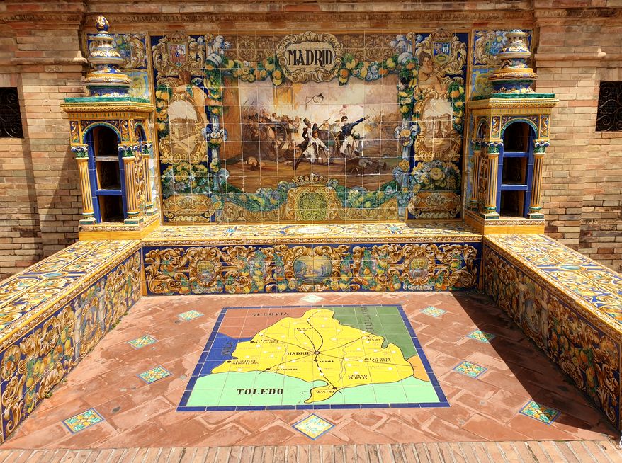 Adossés à la galerie du bâtiments, 48 bancs en céramique représentent les grandes villes d’Espagne.