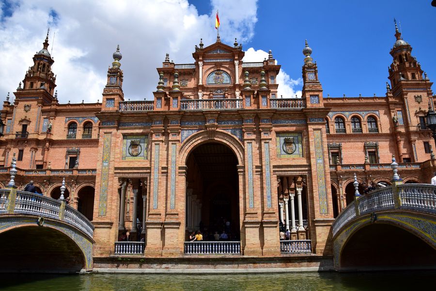 Fastueuse, la plaza de Espaňa ou place d’Espagne est l’oeuvre d’Anibal Gonzalez (1876-1929), le célèbre architecte régionaliste sévillan pour accueillir les grands événements de l’Exposition ibéro-américaine de 1929, célébrant la rencontre entre l’Espagne et ses anciennes colonies.