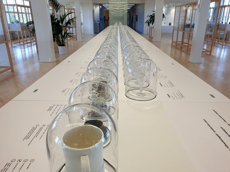 Présentation par époque et sous cloche des tasses caractéristiques de la production d’Arabia au Centre du design d’Helsinki.