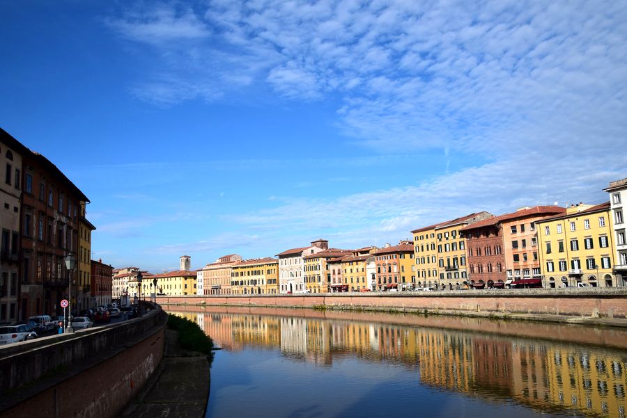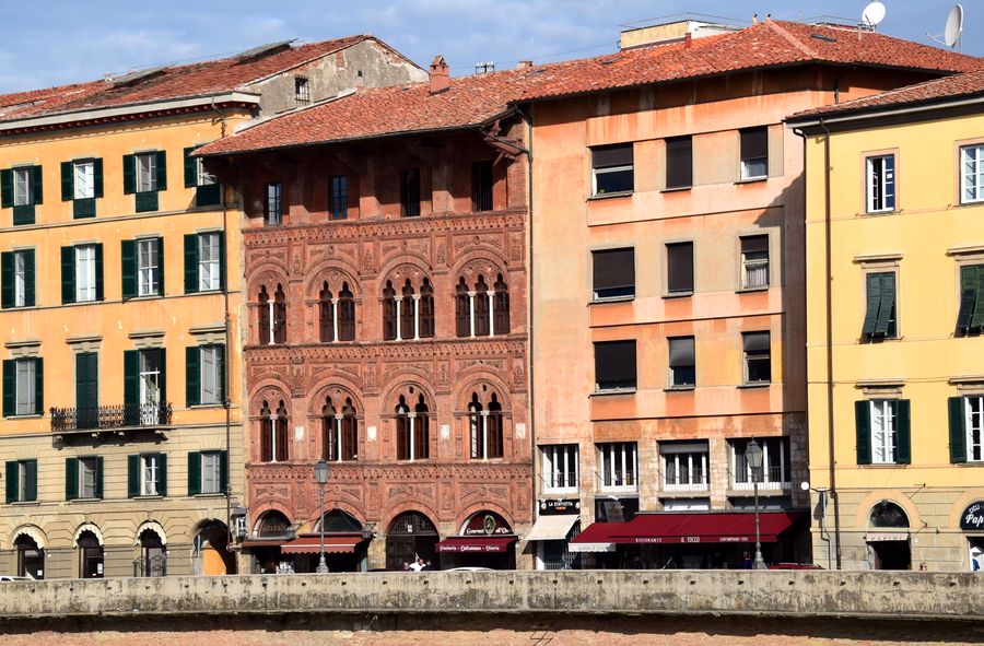 A Pise, j’ai aimé flâner le long de l’Arno dont le cours s’incurve légèrement, bordé de palais ou de beaux immeubles aux couleurs variées. Coup de cœur pour le Palais Agostini couleur pain d’épice avec ses arcades dentelées qui abrite au rez-de-chaussée le café littéraire, Caffé dell’Ussero, ouvert en 1794 sur le lungarno Pacinotti. Plus loin, l’Arsenal delle Galéres ou Arsenale Medicei construit par Cosme 1er entre 1537 et 1574 comporte 7 nefs voûtées, la huitième ayant été détruite au cours de la Seconde Guerre mondiale.