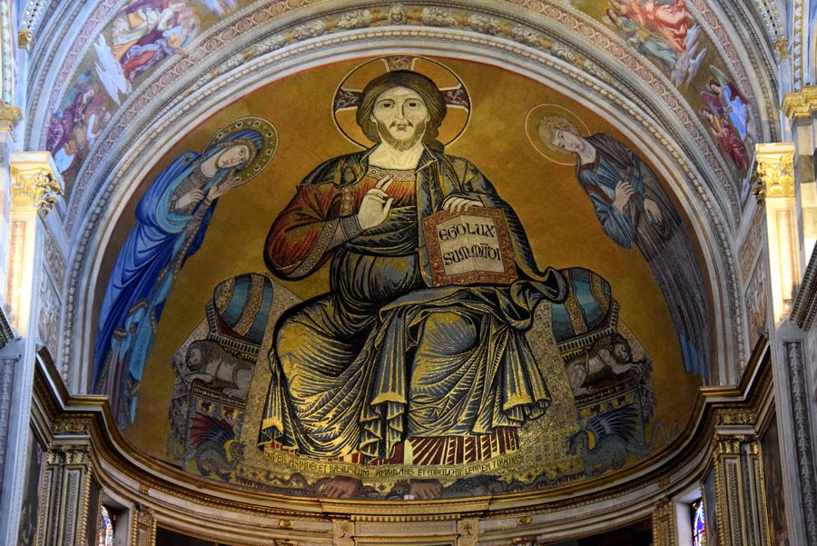 Deux éléments m’ont particulièrement marquée : la chaire de Giovanni Pisano sculptée entre 1302 et 1310 soutenus par des colonnes et des sculptures et le Christ bénissant de la cuvette d’abside aux mosaïques dorées.