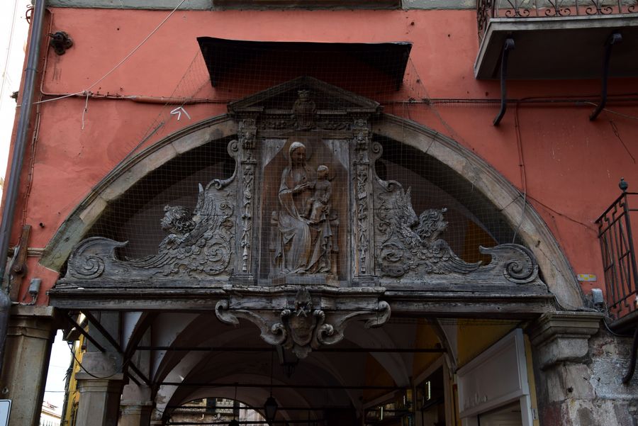 Une vierge en bois marquant le début d’une galerie couverte à Pise.