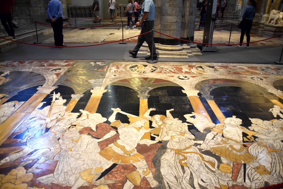 Cependant, ce qui rend cette cathédrale si spéciale c’est son sol. Entre le 14e et le 19e siècle, une quarantaine d’artistes ont oeuvré là pour créer de somptueux tableaux en marqueterie de marbre. Ce sol qui juxtapose des tableaux d’une grande variété de styles n’est pas toujours visible. Il peut être recouvert de tapis qui le protègent. J’ai eu la chance de passer à un moment où il était découvert. Petit désagrément avant d’arriver.J’ai voulu acheter mes billets en ligne pour ne pas trouver porte close au cas où l’affluence aurait été trop importante. Il m’en a coûté 1 euro de plus par personne pour « réservation à l’avance » et je pense pas me tromper autour de 2 euros de plus pour récupérer mes billets par mes mails. C’est la première fois qu’on m’a ainsi taxée ! Le baptistère est aussi très riche.