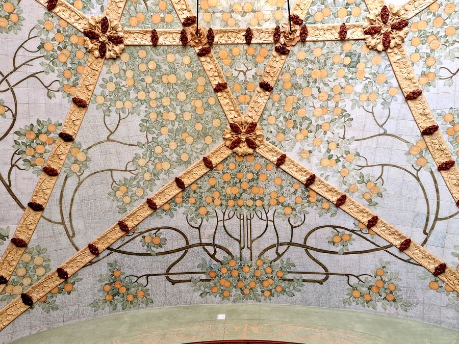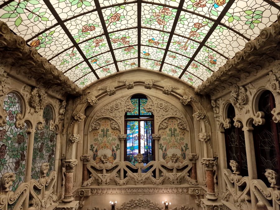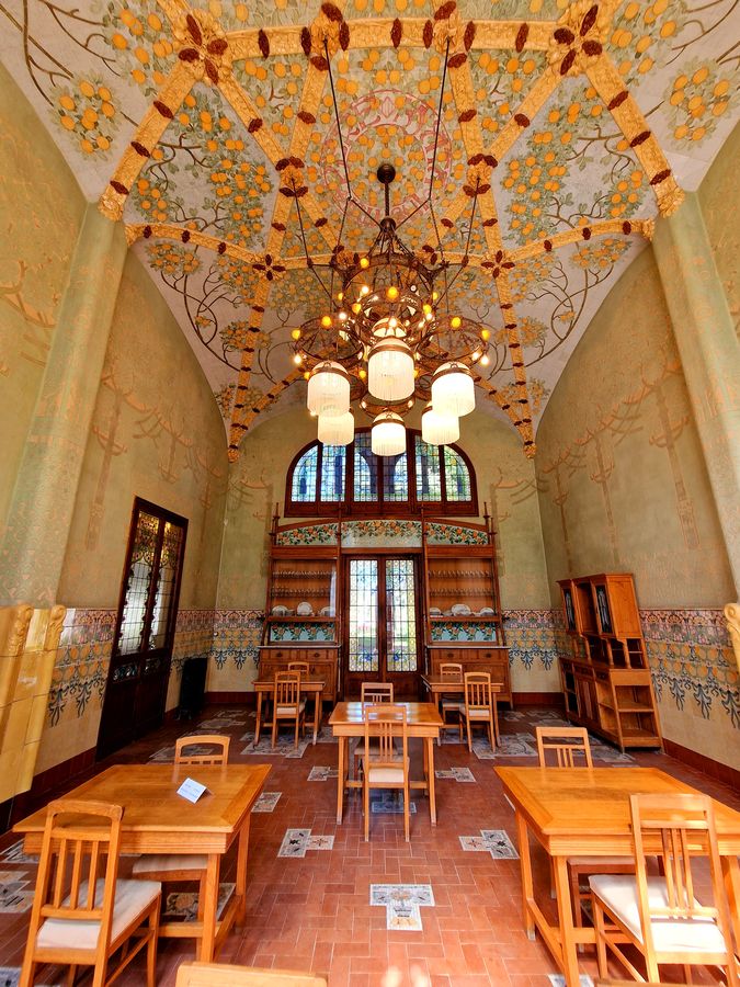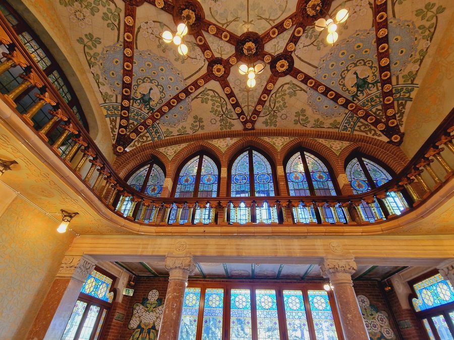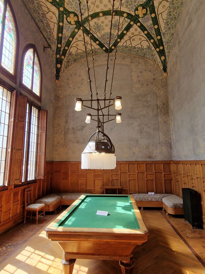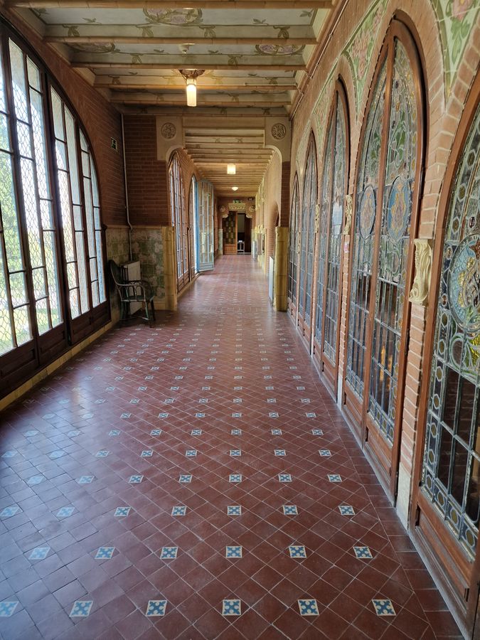 Désormais, on peut visiter le pavillon destiné aux patients riches qui aurait été livré en 1908. Construit en briques et décoré de panneaux en céramique bleus, il s’apparente plus à un hôtel de luxe qu’à asile de fous. Lluis Domenech i Montaner l’a aménagé pour rendre le séjour sûr et agréable. Au rez-de-chaussée, le salon, la salle-à-manger et la salle de jeux avec son billard montrent le niveau d’attention porté à l’agrément des patients. Sols en mosaïques, murs et plafonds habillés de céramique, vitraux, motifs de faune -paons ou cygnes- de flore ou de fruits déclinés dans des tons lumineux sont un plaisir pour les yeux et une invitation au délaissement.