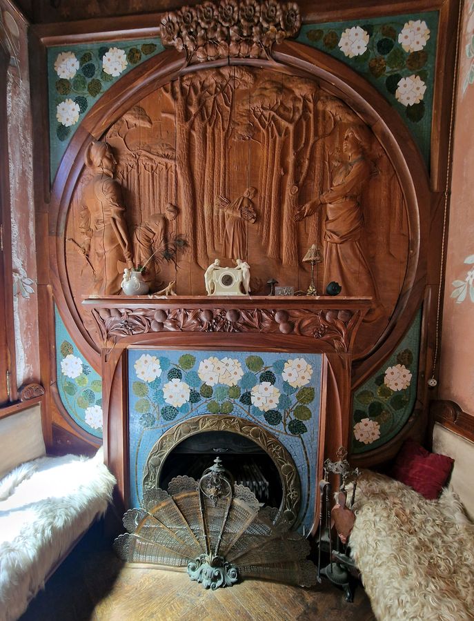Déchauches de sculptures, de mosaïques, de vitraux, de marqueteries autant d’éléments éblouissants complétés par le mobilier. Le tout forme un ensemble moderniste complet et rare.
