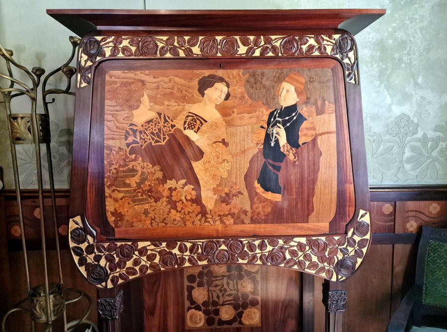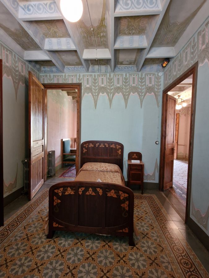 A l’étage, les chambres dont le plafond de certaines sont à caissons sont pourvues d’un mobilier marqueté. Il est dommage que l’ouvrage qui avait été réalisé sur Pere Mata soit épuisé et qu’on ne puisse pas être sûrs du nom artistes qui ont accompagné Lluis Domenech i Montaner dans son œuvre créative.