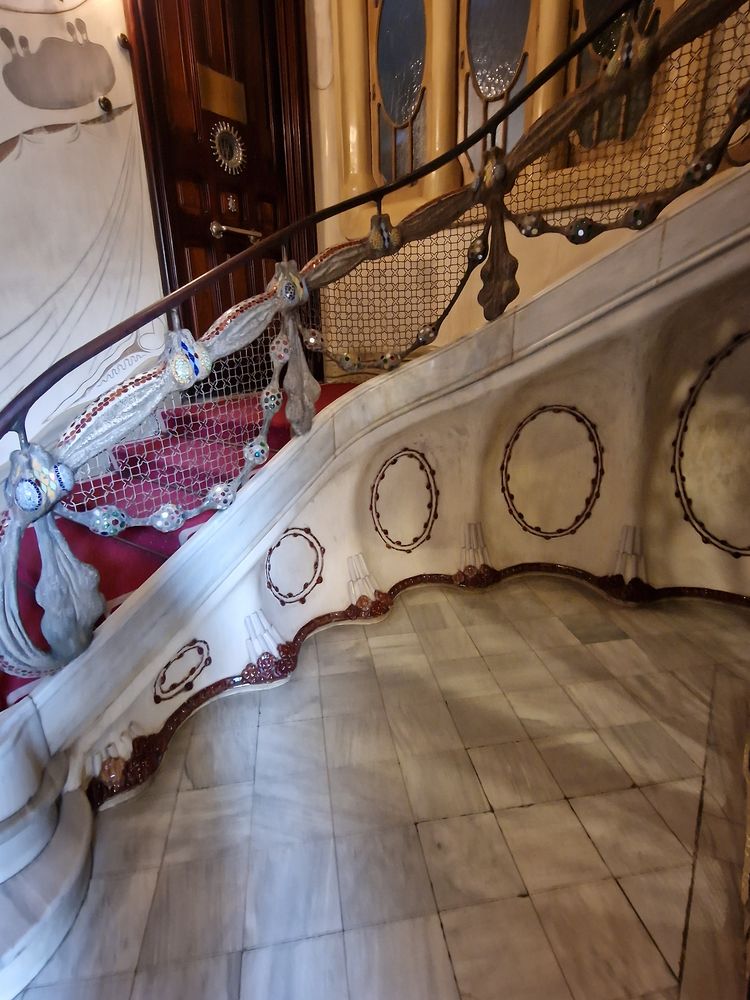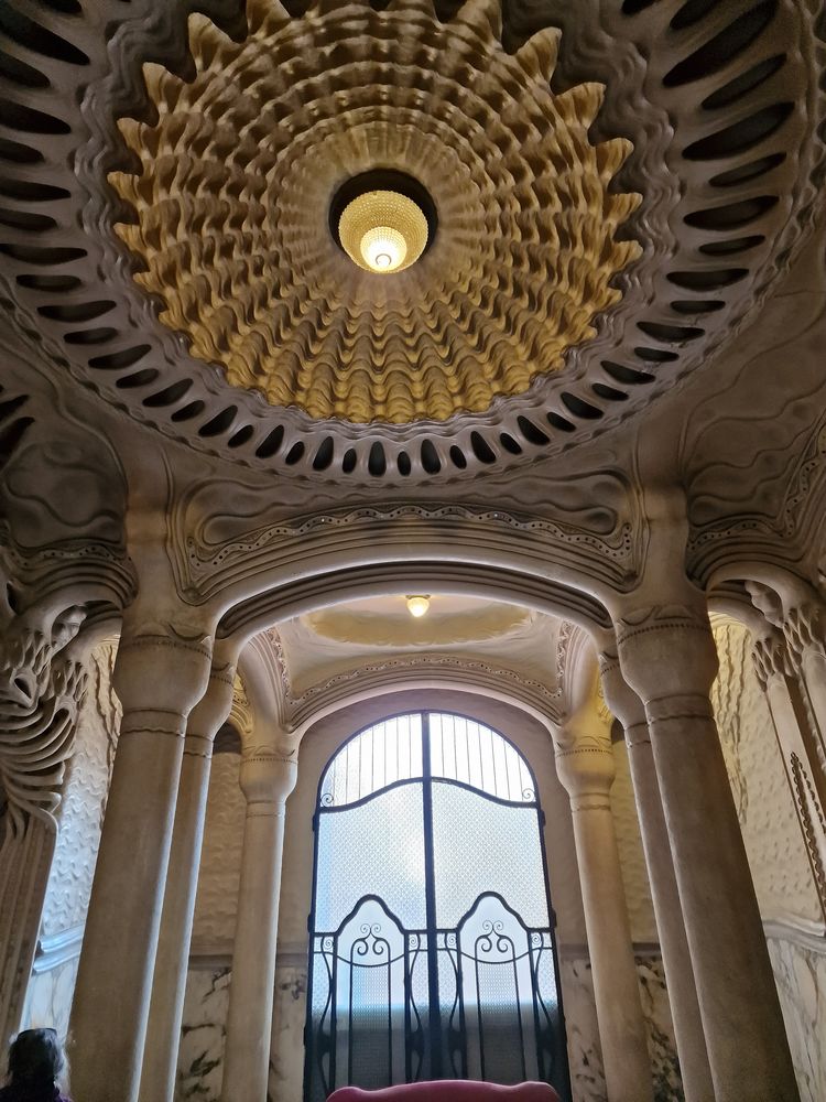 La Casa Sayrac fait partie des stars modernistes de Barcelone mais on doit habituellement se contenter d’en admirer la façade fort réussie mais qui laisse l’amateur d’architecture sur sa faim. C’est Manuel Sayrac i Carreras en 1918. L’extérieur affiche une certaine simplicité démentie par les décors des halls d’entrée. Le stuc y prend les formes les plus travaillées, au plafond ou sur les murs, avec des découpes et des reliefs qui reconstituent un univers marin fantasmé -squelettes d’animaux fantastiques, fonds de sable- . Stuc, fer forgé, céramique composent un cadre fascinant. On ne se rassasie pas de contempler les détails. On y passerait des heures à les recenser mais la visite est trop courte.